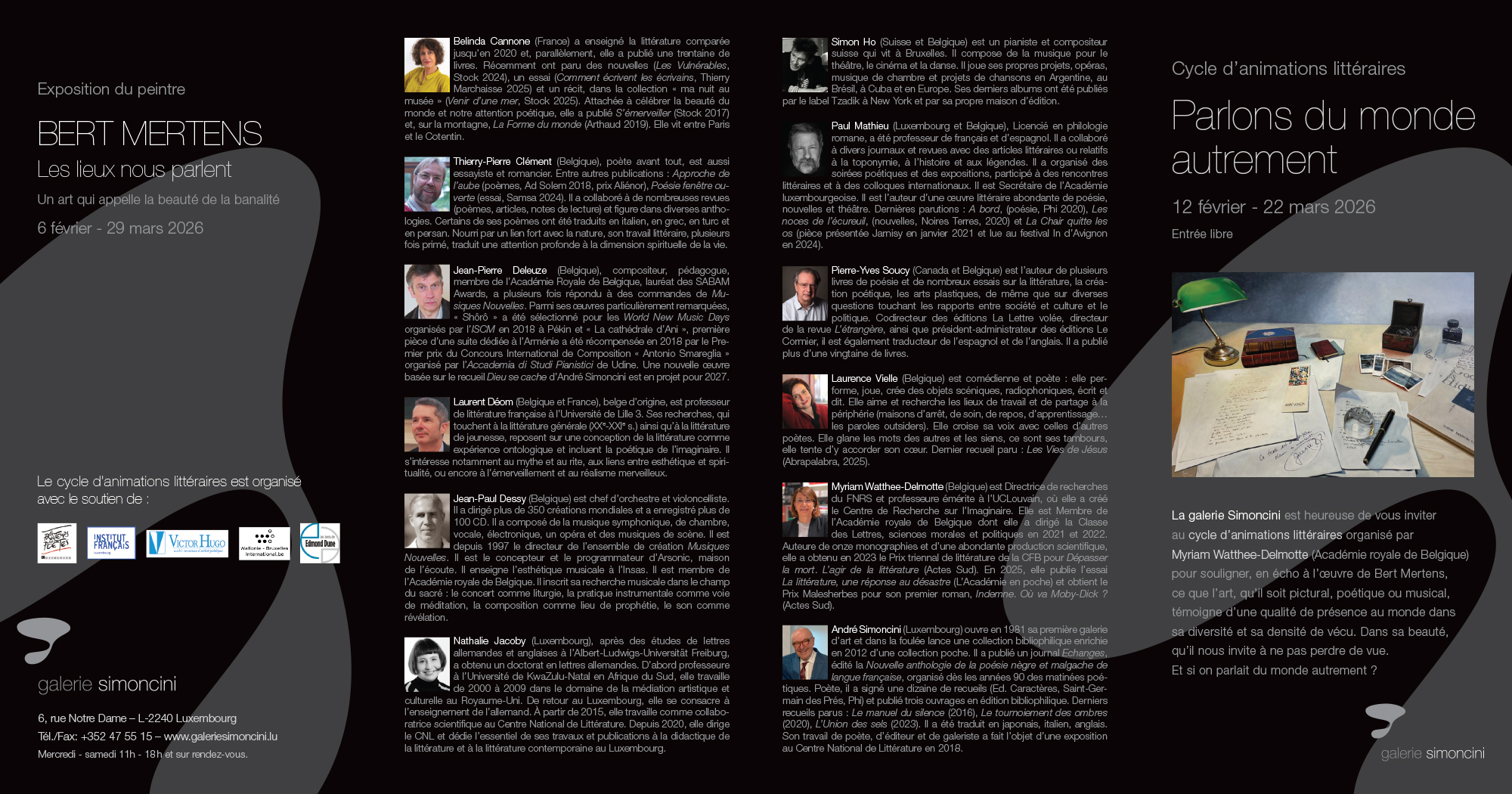 A series of literary events is being organized by Myriam Watthee-Delmotte (Royal Academy of Belgium, Letters Section) to highlight, in response to the work of Bert Mertens, how art—whether pictorial, poetic, or musical—bears witness to a quality of presence in the world in its diversity and the richness of lived experience. In its beauty, which it invites us not to lose sight of. And what if we talked about the world differently?
